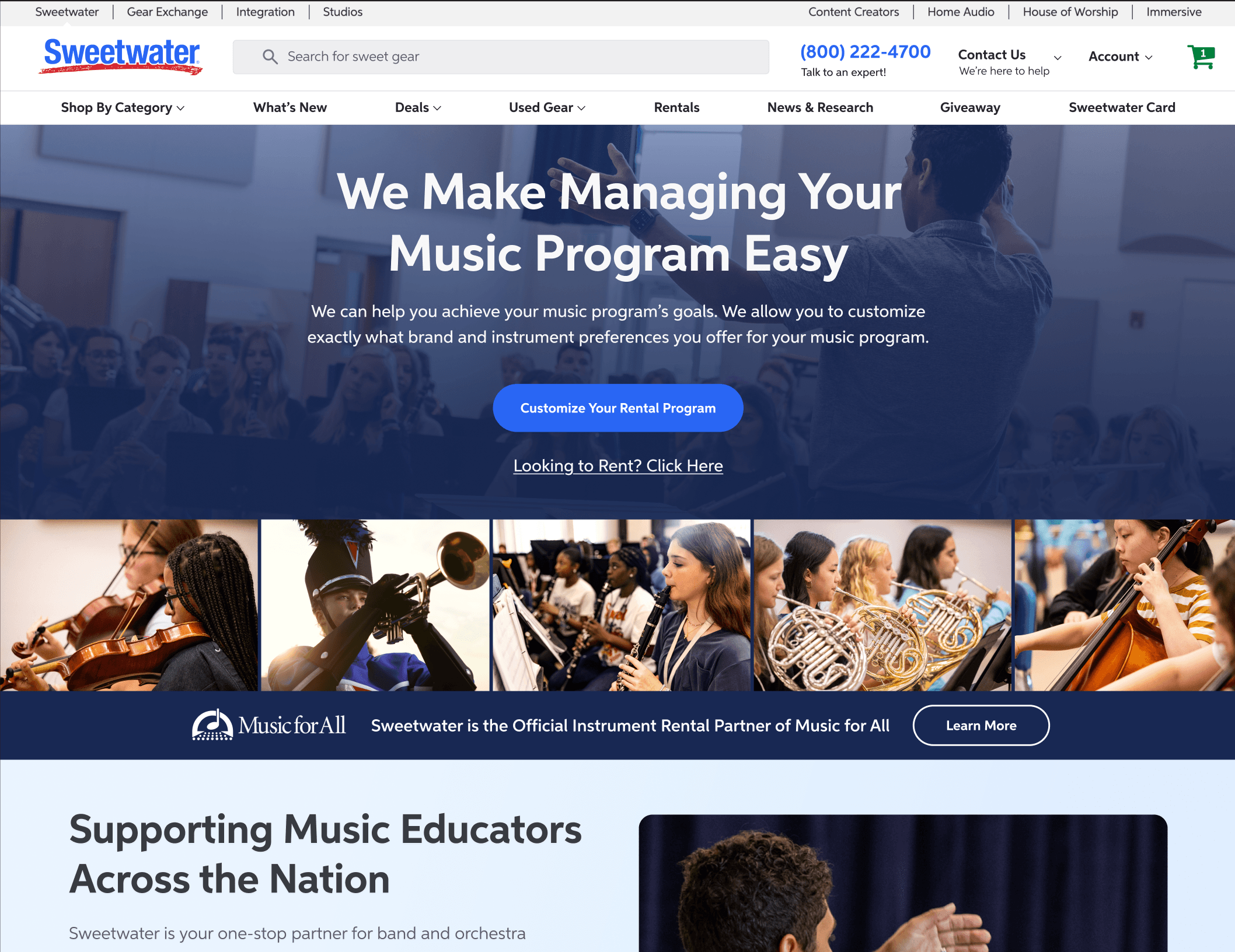 Because of the relationships I formed with stakeholders over the course of the Rental Manager project, I was asked for by name to redesign the website’s landing pages for band and orchestra rentals. The previous design of this page was acceptable according to the stakeholders, but it was dated and didn’t really match with the printed material that sales and marketing were using. I worked closely with these teams to create something that was updated to the new Sugar Design System styles while still meshing well with existing print design.